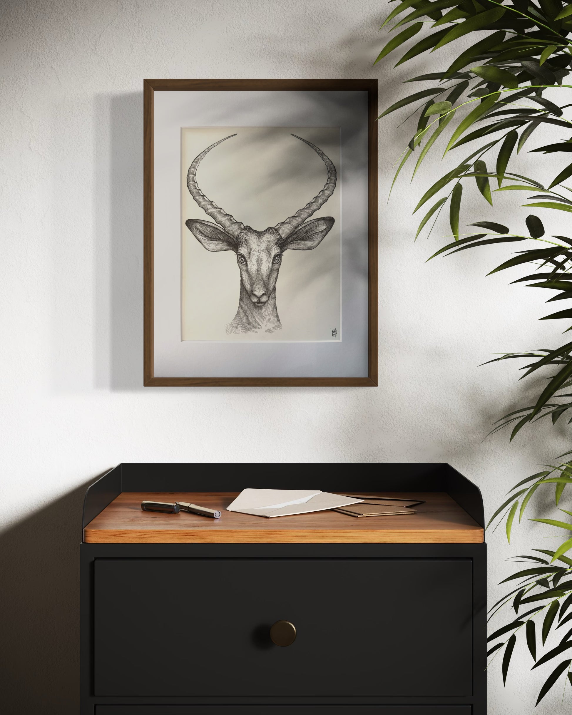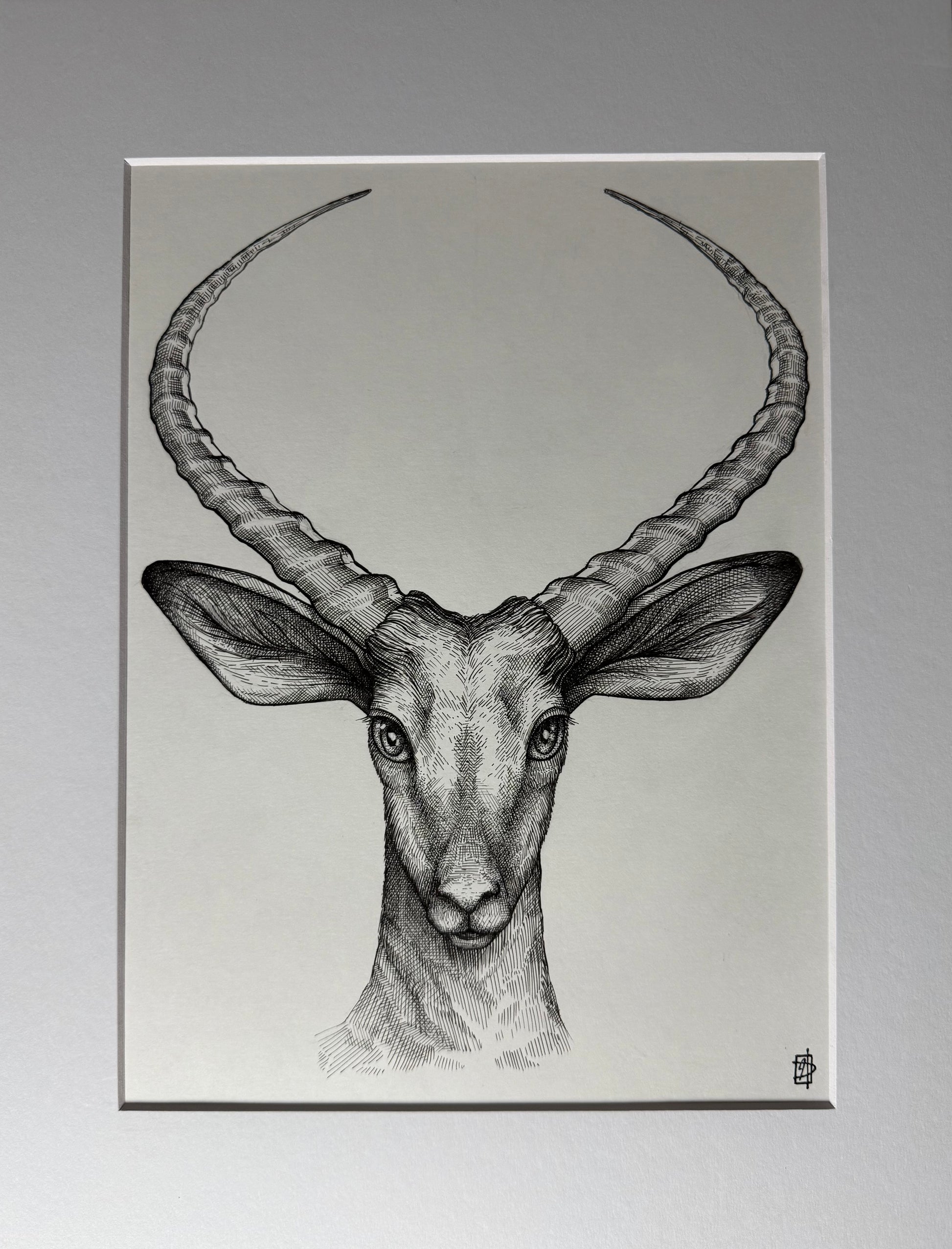 Hight quality hand-drawn pen and ink impala illustration by Jake Donovan. Drawing comes in a 12x16" wooden frame with tempered glass. Purchase of drawing comes with original signature and certificate of authenticity.