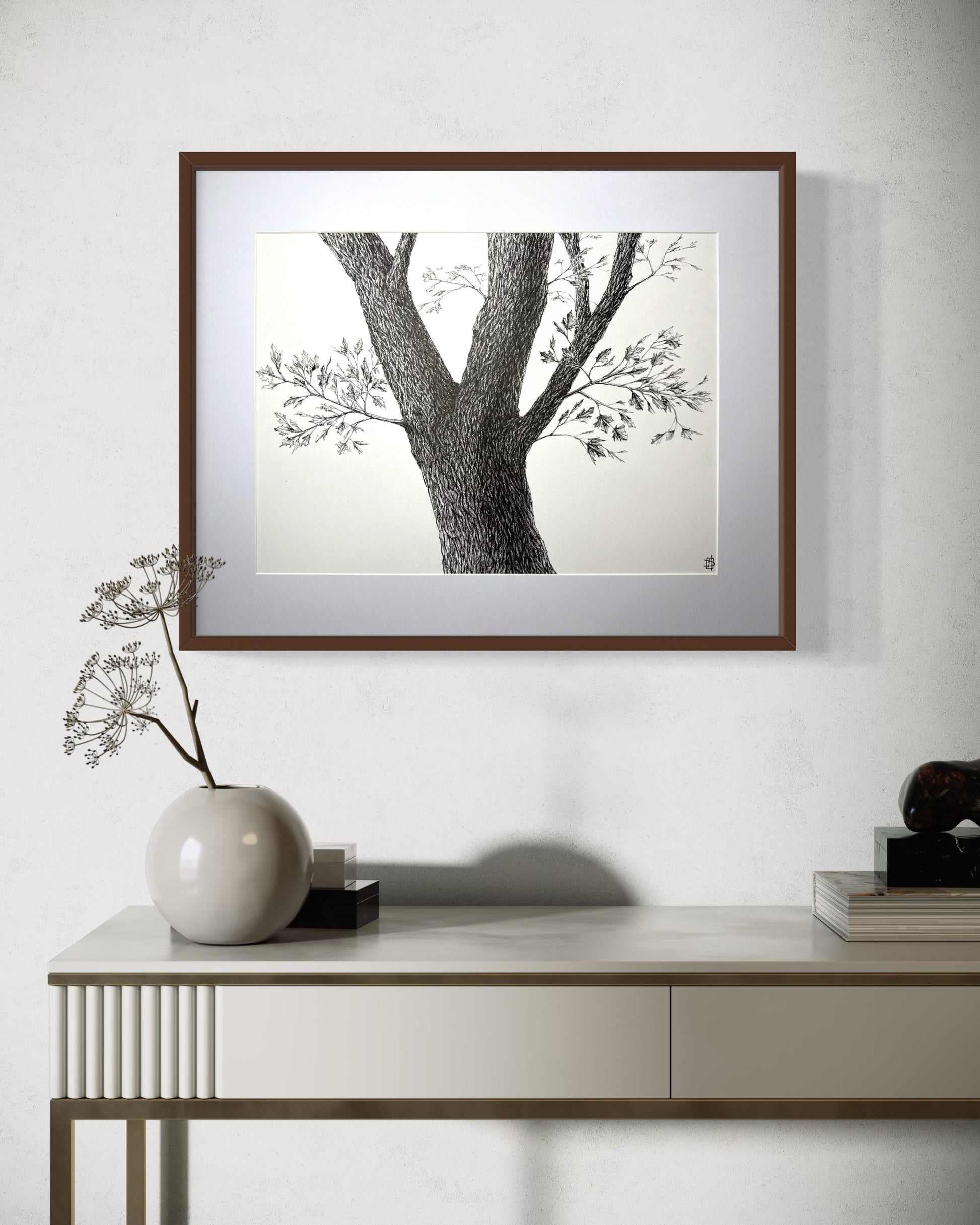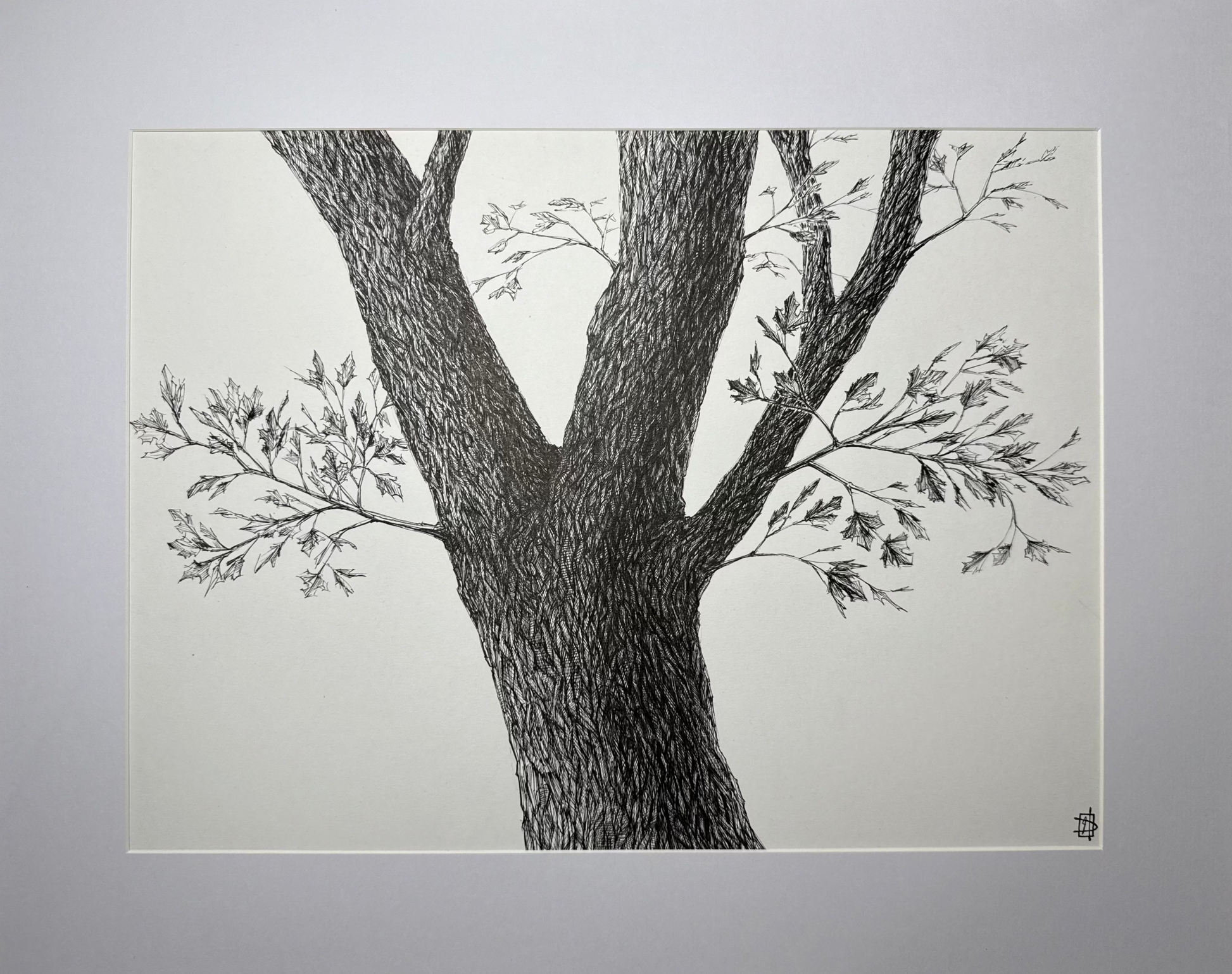 High quality hand-drawn pen and ink maple tree illustration by Jake Donovan. Drawing comes in a 16x20" walnut frame with tempered glass. Purchase of drawing comes with original signature and certificate of authenticity.